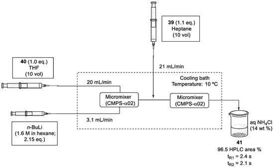 Consecutively, the n-BuLi-mediated coupling reaction between aldehyde (39) and sulfone fragment (40) was optimized. For this process, two micromixers were positioned sequentially and solutions of sulfone (40) in THF, n-BuLi (1.6 M in hexane), and aldehyde (39) in heptane were fed into the system via syringe pumps. After mixing, the reaction was immediately quenched with an aqueous solution of NH4Cl. To obtain a better conversion, the flow rate was increased to 20 mL/min and the reaction was performed at 10 °C, a higher temperature than in batch conditions (Scheme 11). To avoid the degradation of compound (41), residence times could not be longer than 2.4 s for lithiation and 2.1 s for the coupling reaction [56].