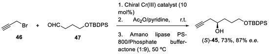 The desired propargyl alcohol (S)-45 was previously prepared by Cr(III)-mediated catalytic enantioselective propargylation of the corresponding aldehyde (47) with propargyl bromide (46), in a 73% yield and with 87% e.e. To obtain the pure enantiomer, the reaction was performed with the enzyme dissolved in an aqueous buffer (Scheme 13) [58].