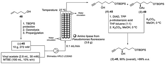 The recovery and recycling of the enzyme was difficult under these conditions (Scheme 13). Thus, S. Gosh et al. proposed a continuous mode to synthesize the pure enantiomer (S)-45 by enantioselective enzymatic acylation of the racemic homopropargyl alcohol (±)-45. Firstly, racemic homopropargyl alcohol (±)-45 was obtained in a 69% yield from pent-4-en-1-ol (48) in three reactions steps: (i) protection of hydroxy group, (ii) ozonolysis, and (iii) propargylation. Then, a continuous kinetic resolution was carried out in a jacketed stainless-steel reactor at 27 °C with a circulating water bath. A mixture of the alcohol (±)-45 and vinyl acetate dissolved in methyl tert-butyl ether (MTBE) was pumped into the packed-bed reactor (PBR). After the enzymatic reaction, optically pure homopropargyl alcohol (R)-45 and acylated (S)-49 were obtained. The enzyme packed in the reactor could be used continuously for 1 week, maintaining a productivity of 1.12 mM/h/g. Finally, both compounds were treated and isolated properly to produce the desired pure alcohol (S)-45 with a 90% overall yield and >99% e.e (Scheme 14) [57].