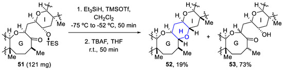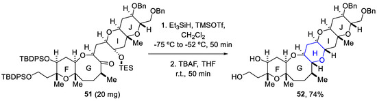 Different synthetic methodologies have been reported by Oishi and coworkers to build the different ring systems in batch mode [66,67,68,69]. Thus, reductive etherification was applied as a key step for constructing the H-ring using Et3SiH/TMSOTf. Consequently, silyl groups were removed using TBAF and the FGHIJ ring unit (52) was afforded as a single diastereomer in a 74% yield for the two reaction steps (Scheme 15) [70].