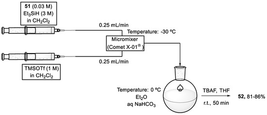 To avoid the formation of by-product (53), a microflow reactor was used for carrying out the reductive etherification (Scheme 17). Therefore, two solutions were transmitted to the microflow reactor at −30 °C using a syringe pump at 25 mL/min. One of the solutions contained compound (51) (0.03 M) and Et3SiH (3 M) in dichloromethane, and the other TMSOTf (1 M) in the same solvent. Both solutions were mixed vigorously through a 50 μL volume reactor. Aqueous NaHCO3 at 0 ℃ was used to quench the resulting mixture which flowed out, and, after extraction with diethyl ether, the crude product was treated with TBAF in THF to give the desired FGHIJ ring unit (52). The new methodology was not affected by the reaction scale, because both solutions were continuously mixed when charged into the reactor and the yield remained around 86%, even if 1.5 g of the substrate is used [71,72].