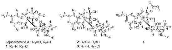 Our recent genomic and spectroscopic signature-based discovery of 9-membered enediyne-derived cycloaromatized compounds involved the screening of a bacterial DNA library (1080 strains), from which we selected 62 actinobacterial strains bearing 9-membered enediyne core genes []. The subsequent cultivation of the strains in Cl-enriched media and the identification of Cl-bearing compounds in their extracts based on the characteristic isotopic signature of Cl successfully identified the first 9-membered enediyne product, jejucarboside A, since the discovery of amycolamycins A and B [] in 2017. The discovery of structurally novel jejucarboside A bearing a new amino sugar, i.e., 3-methyl-4-methylamino-4,6-dideoxy-d-gulose, coupled with enediyne core-derived chlorinated cyclopenta[a]indene aglycone incorporating carbonate functionality may lead to subsequent studies seeking to diversify the structures of 9-membered enediyne-derived natural products. Since the discovery of jejucarboside A from marine Streptomyces sp. JJC13, collected on Jeju Island, Republic of Korea, extensive subculture selection was performed, because its yield was extremely low, i.e., 8 μg/L. The production level was subsequently enhanced by approximately 150 folds, resulting in a final yield of 1.25 mg/L, which enabled further chemical exploration, allowing us to discover new jejucarboside A congeners and thereby broadening the chemical diversity of 9-membered enediyne-derived compounds. In this study, we report the discovery, structure elucidation, and biological activity of four new chlorinated cycloaromatized enediyne-derived compounds, jejucarbosides B–E (1–4) (Figure 1).