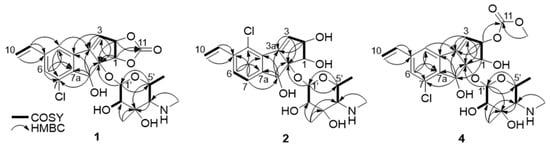 The COSY signal from H-1′ to H-2′ confirmed that the dioxygenated carbon C-1′ and oxygenated carbon C-2′ were connected. H3-7′, one of the singlet methyl groups, exhibited HMBC correlations with C-2′, C-3′, and C-4′, thus assigning C-7′ to the fully substituted carbon, C-3′. The other singlet methyl group, H3-8′, had HMBC correlation with C-4′, which revealed that C-8′ was connected to C-4′ via a nitrogen atom. The chemical shift of C-8′ was 39.1 ppm, which suggested the existence of a methylamino group, rather than a methoxy group. Based on the H3-6′/H-5′ COSY correlation, the doublet methyl group at C-6′ was connected to C-5′. The COSY correlation between H-4′ and H-5′ secured the C-4′-C-5′ connectivity. The HMBC signals from H-1′ to C-5′ and H-5′ to C-1′ indicated the presence of an amino sugar as a hexose structure. The sugar moiety was then connected to C-8a in the cyclopenta[a]indene aglycone via H-1′/C-8 HMBC correlation. After elucidating most of the structure of 1, one chlorine atom remained, and C-7 still required a functional group to complete the structure. The chlorine atom in the molecular formula was determined to be located at C-7, differing from jejucarboside A, which bears a chlorine atom at C-4 (Figure 2)
