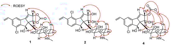 Key ROESY correlations of jejucarbosides B (1), C (2), and E (4).