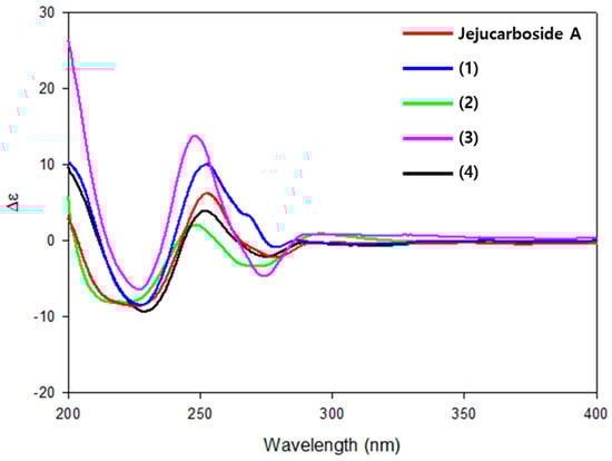 Jejucarboside E (4) was also yielded as a white powder by chromatographic purification. The HRESIMS data of 4 revealed its molecular formula to be C24H30ClNO9, which bears additional CH4O. Comparing the 1H NMR spectrum of 4 with those of 1–3 indicated that jejucarboside E (4) is structurally analogous to 1–3; however, this comparison also clearly identified an additional methoxy group (δH 3.77). Our analysis of the 1D and 2D NMR spectra assigned all the protons and carbons. The methoxy protons displayed a HMBC correlation to C-11, i.e., the carbonate carbon. In addition, C-1/H-1 were observed at δC 68.9/δH 4.54, indicating that C-1 contained a hydroxy group, like jejucarbosides C and D. Unlike 1, only H-2 showed a HMBC correlation to C-11, and the chemical shifts of C-2 and H-2 were 84.0 and 5.61 ppm, indicating that the carbonate functional group was connected to C-2. Therefore, jejucarboside E (4) was determined to be a new congener of 1 bearing a methoxy group connected to the carbonate group at C-2. An analysis of the ROESY spectrum supported the position of the methoxy group by H3-11-OMe/H-2 correlation and established the relative configuration (Figure 3). The absolute configuration of 4 was deemed to be identical to those of 1–3 based on their consistent ECD spectra (Figure 4).