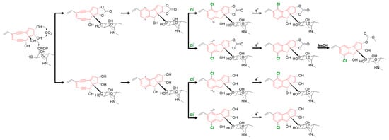 Therefore, theoretically, both jejucarbosides A and B should be produced at a 1:1 ratio. In the time course analysis of the metabolic profiles of JJC13, these compounds were produced at a 1:1 ratio, even though the yield of 1 was lower than that of jejucarboside A after purification, because 1 required more complicated chromatographic procedures. However, not every cycloaromatized enediyne generate both chlorinated compounds at a 1:1 ratio. C-1027 chromophore-V and fijiolides have only one chlorinated form, probably because of steric hindrance due to their more complicated ring structures. Jejucarbosides C and D (2–3) are new compounds without carbonate functionality from the same enediyne pathway as jejucarbosides A and B. Jejucarboside D (4) could be produced by methoxylation at the carbonate carbon from 1 (Figure 5).