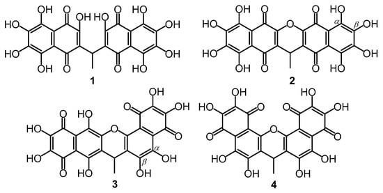 Ethylidene-bis(trihydroxynaphthazarin) 1, dibenzo[b,i]xanthentetraone 2 and two isomeric dibenzo[b,h]- (3) and dibenzo[c,h]- (4) xanthentetraones. In contrast to [], all quinonoid compounds are depicted as derivatives of 1,4-naphthoquinone.