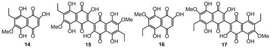 In addition, compounds 13 and 8 were synthesized, and the latter was shown to be completely identical to bisnaphthazarin isolated from the lichen C. cucullata []. Thus, treatment of monomethyl ether 14 with (NH4)2S2O8 in MeCN-H2O gave the bisnaphthazarin dimethyl ether 15 (30%) (Figure 4). Compound 15 was easily converted into the corresponding bis(2,6-dihydroxynaphthazarin) 13 by the action of AlCl3 in nitrobenzene (44%). In the same way the ether 16 via dimethyl ether 17 was converted into bis(2,7-dihydroxynaphthazarin) 8 (total yield 21%).
