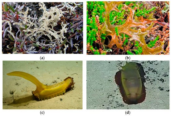 Photography of lichens and abyssal sea cucumbers in which cuculoquinone (8) was found: (a) Cetraria cucullata; (b) C. islandica; (c) Psychopotes longicauda; (d) a member of the genus Benthodytes.