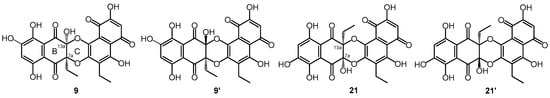 Based on the accumulated spectral data, it was concluded that islandoquinone is one of four dioxabenzo[a]tetracenetetraones from the two diastereoisomeric pairs of 9, 9′ and 21, 21′ (Figure 7). According to quantum chemical calculations [], the diastereoisomers 7aS*,13aS*- (9) and 7aR*,13aR*- (21) are more favorable than the corresponding diastereoisomers 7aS*,13aR*- (9′) and 7aR*,13aS*- (21′). The difference in Gibbs energy between 9 and 21 is only 0.4 kcal/mol []. The conclusive choice in favor of either 9 or 21 may be based on the X-ray diffraction analysis of islandoquinone or structurally similar compounds.