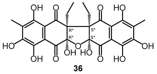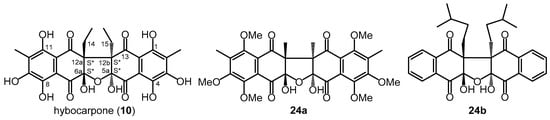 The cytotoxic pentacyclic naphthazarin-derived dimer, hybocarpone (10), was isolated from the lichen Lecanora hybocarpa by Elix J. A. and co-workers in 1999 [] (Figure 10).