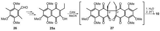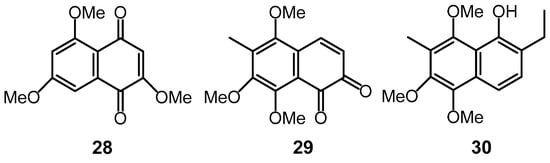 More recently, another route to substituted 1,4-naphthoquinone 25a from flaviolin trimethyl ether 28 [,], o-naphthoquinone 29 [], and α-naphthol 30 [] were proposed (Figure 12). These approaches include the multistep synthesis of both the key substrates 26, 28–30 themselves, and their subsequent conversion to hybocarpone (10).