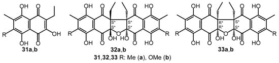 The products of the oxidative coupling of hydroxynaphthazarin 31a (32a and 33a) and methylcristazarin (31b) (dimethyl ethers 32b and 33b).