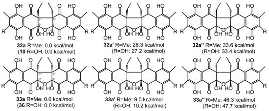 Calculated relative Gibbs energy of the possible dihydrobinaphthofurantetraones 32a, 32a′, 32a″ derived from the S*,S*-diastereoisomer 34a and 33a, 33a′, 33a″ derived from the R*,S*-diastereoisomer 35a [,]. (Values of the calculated energy of hybocarpone (10), its R*,S*-diastereoisomer 36 and other diastereomeric furan systems are presented in parentheses).