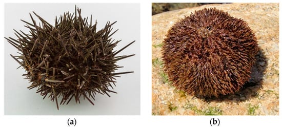 Photography of producing mesocentroquinone sea urchins: (a) Mesocentrotus nudus; (b) Strongylocentrotus intermedius.