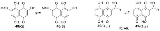IR spectroscopy is a much faster method when compared to nuclear magnetic resonance spectroscopy, in which there is usually no temporal averaging of spectral parameters. Therefore, the IR spectrum of mompain monomethyl ether 48 taken in CDCl3 showed that this compound is a mixture of 1,4-naphthoquinoid tautomers 48(Q) and 48(B), and in commensurate proportions (70% and 30%, respectively) [,]. In addition, quantum chemical calculations, using the example of 1′-hydroxyalkyl naphthazarin 6 [], showed that the energy barrier for a process of type 49(Q1.4) ⇆ 49(Q1.5) (Figure 22) is less than 5 kcal/mol [], which makes possible the existence of corresponding 1,5-naphthoquinoid forms. Later, it was shown by IR spectroscopy that in aprotic organic solvents, 1′-hydroxyalkyl naphthazarins are in the form of a mixture of 1,4- and 1,5-naphthoquinoid tautomers [].