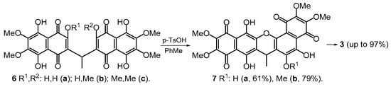 Cyclization of ethylidene-bis(trihydroxynaphthazarin) methyl ethers 6a–c to derivatives 7a–b, a key step in the synthesis of mirabiquinone (3).