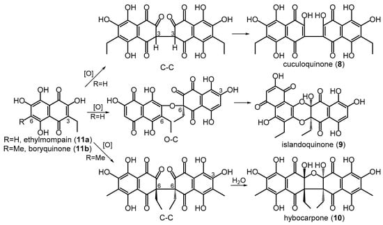 Other representatives of this group of compounds are dimeric (poly)hydroxynaphthazarins 8–10 [,,], which are products of the oxidative C-C or C-O coupling of ethylmompain (11a) and boryquinone (11b) (Scheme 3).