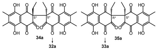 S*S*- (34a) and R*S*- (35a) hexaketone intermediates, the precursors of the S*,S*,S*,S*- (32a) and S*,R*,R*,S*- (33a) binaphthofurantetraones.