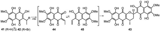 Our attempts to synthesize compound 38 by bromination of echinochrome dimethyl ether 41 and subsequent hydrolysis of 1′-bromo derivative 42 already at the first stage led to an unexpected result. The final and main product of the reaction was 2-naphthoquinonylbenzo[g]chromendione 43 (up to 80%) (Scheme 6) [].