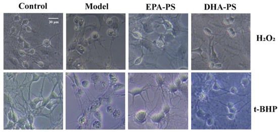 According to our previous publications, 10 μg/mL EPA-PS, 10 μg/mL DHA-PS, 400 μmol/L H2O2 and 100 μmol/L t-BHP were selected as the concentrations for subsequent experiments [,]. In this study, we used a microscope to study the protective function of DHA-PS and EPA-PS on the H2O2- or t-BHP-induced oxidative damage of hippocampal neurons. As shown in Figure 2, in the control group, the neuron body was full, with more and longer protrusions, and the cell refraction was good, while the boundary was neat and smooth. When treated with H2O2 or t-BHP, the neurites of neurons became significantly shorter, with the swelling of cells, atrophy of the cytoplasm, a reduced refractive index and damage to parts of the neuronal membrane. Compared with the model group, after incubation with EPA-PS and DHA-PS, the cell membrane boundary became neat and smooth, synapses were restored, and the neural network structure was improved. Phospholipids are the most important lipid components in the brain and have neuroprotective effects []. The sn-2 site of marine-derived phospholipids is rich in polyunsaturated fatty acids, making it more biologically active in brain function []. PS is a major anionic phospholipid substance, enriched in the cerebral cortex [], which is involved in the regulation of neurotransmitter release and neuron survival and differentiation [,]. It has been reported that the EPA-PS and DHA-PS treatments significantly decreased neuronal death induced by Aβ42, and the improvement effect of DHA-PS is more pronounced []. In addition, the results of our study may be affected by impurities because fewer than 5% of the impurities are contained in DHA-PS and EPA-PS [].