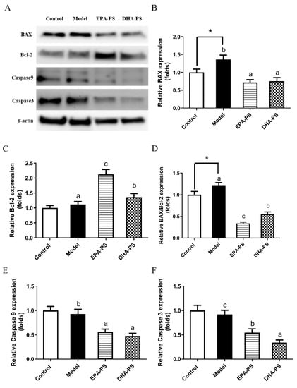 Effects of EPA-PS and DHA-PS on the expression of apoptotic proteins in primary hippocampal neurons after oxidative damage. Representative western blots (A) and relative expression of BAX (B), Blc-2 (C), BAX/Blc-2 (D), Caspase 9 (E) and Caspase 3 (F) in primary hippocampal neurons. The expressions were detected by Western blotting analysis and normalized with β-actin. * p < 0.05 indicates significant differences compared with the control group. Different letters represent significant differences at p < 0.05 among treated groups. This figure shows the mean ± SEM of 3 experiments.