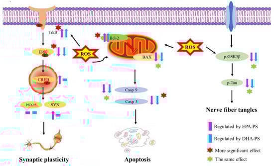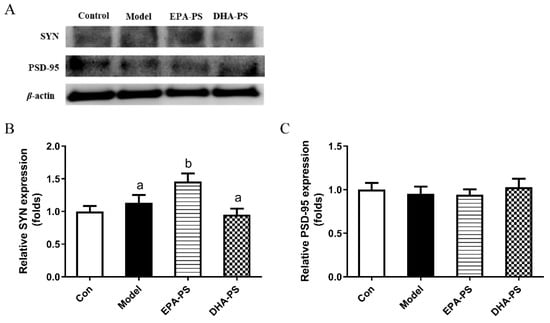 PS influx into absorptive cells occurs after its hydrolysis to lysoPS, and lysoPS, after diffusion into intestinal cells, is sequentially converted into PS and PE, which make up a minor fraction of the lipids present in lipoproteins []. The brain is one of the tissues with high capacity to synthesize PS []. In mammalian tissues, PS is synthesized from either PC or PE exclusively by Ca2+-dependent reactions, where the head group of the substrate phospholipids is replaced by serine []. These base-exchange reactions are catalyzed by phosphatidylserine synthases (PSS) [], which are localized in the endoplasmic reticulum, particularly enriched in the mitochondria-associated membrane regions of the endoplasmic reticulum []. Therefore, dietary DHA-PS and EPA-PS do not enter primary hippocampal neurons in their original form, but are synthesized again after digestion and absorption. It has been reported that oral PS was absorbed efficiently in humans and crossed the blood–brain barrier following its absorption into the bloodstream, increasing the content of PS in the brain [,] and its incorporation into neuron cell membranes []. The incorporation of adequate amounts of PS within nerve cell membranes is required for efficient neurotransmission throughout the human nervous system []. In addition, our previous study found that a high-fat diet significantly reduced the levels of PS/pPE containing DHA, PS containing DPA, and PE containing AA in the cerebral cortex of SAMP 8 mice, but dietary DHA-PC and DHA-PS significantly restored lipid homeostasis []. Therefore, although DHA-PS and EPA-PS do not enter the hippocampus in their original form, the dietary supplementation of DHA-PS and EPA-PS is still significant for hippocampal neurons.