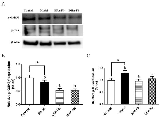 Data are expressed as means ± SEM, and the reported values are representative of three independent experiments. The comparison between the control and model groups was carried out using Student’s test * p < 0.05. Differences among the three groups, model, EPA-PS and DHA-PS, were tested via one-way ANOVA (Turkey’s test), and different letters (a, b, c) indicated different significance at p < 0.05.