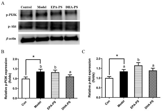 The effects of EPA-PS and DHA-PS on the PI3K/Akt signaling pathway in neurons after oxidative damage. Representative western blots (A) and relative expression of p-PI3K (B) and p-AKT (C) in primary hippocampal neurons. The expressions were detected by Western blotting analysis and normalized with β-actin. * p < 0.05 indicates significant differences compared with the control group. Different letters represent significant differences at p < 0.05 among treated groups. This figure shows the mean ± SEM of 3 experiments.