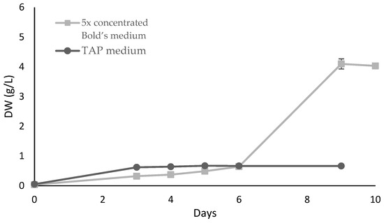 The highest biomass concentration (4.1 g/L) was reached using Bold’s medium while TAP medium only reached 0.81 g/L, as depicted in Figure 1. Comparing the composition of both media, 5× concentrated Bold’s medium had a higher concentration of most nutrients, particularly nitrogen and phosphate, which could influence Scenedesmus growth as it also affected the growth of Chlorococcum sp. and S. acuminatus in other published studies [5,6].