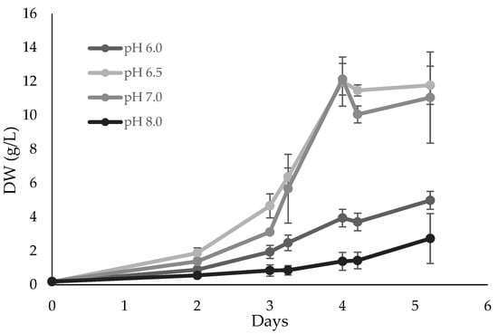 The pH determines the solubility of nutrients and drives many cellular responses, which can significantly influence overall microalgal metabolism [34]. The optimal pH was, therefore, searched. Four pH values were used during the experiments (6.0, 6.5, 7.0, and 8.0, Figure 3). The pH was maintained using 80 mM of PIPES buffer.