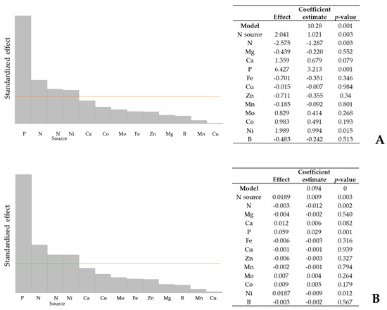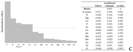As previously mentioned, nutrients are essential for the growth and development of microalgae. In this way, 12 nutrients were studied under different concentrations: N, Mg, Ca, P, Fe, Cu, Zn, Mn, Mo, Co, Ni, and B. Factors and their concentrations were chosen based on previously tested media (TAP and Bold’s). Screening was carried out to predict which nutrients influence biomass productivity (Figure 4). Nitrogen sources (nitrates and ammonia) were included to understand their influence on/under different concentrations of other nutrients.