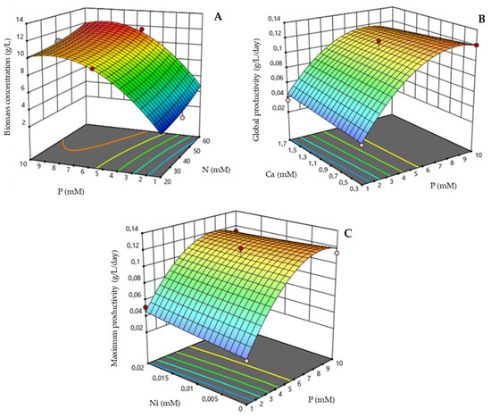 Finally, P and Ni at the highest level (10 and 0.02 mM, respectively) and N and Ca at the central point induced higher maximum productivity values (Figure 5C). The model predictions are described by Equation (3) (p < 0.05).