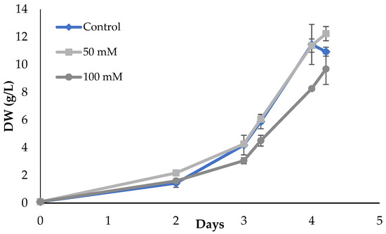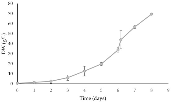 In a study performed with Chlorella vulgaris, biomass reached 175 g/L in a 7 L heterotrophic scale-up phase [7]. Nevertheless, this higher biomass titer was achieved after further medium and abiotic parameter optimization steps.