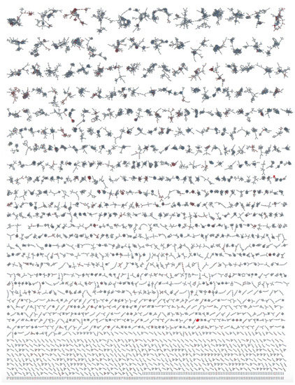 Aliquots (0.1 μL) of the daughter plates (960 extracts and 95 authentic pure marine natural products) were analysed on an Agilent 6545 QTOF LC/MS equipped with an Agilent 1290 infinity II UHPLC system, utilising an Agilent SB-C8 1.8 μm, 2.1 × 50 mm column, with a 0.5 mL min−1 gradient elution over 4.5 min from 90% H2O/CH3CN to CH3CN, followed by isocratic elution with CH3CN for 1 min, with a constant isocratic 0.1% formic acid/CH3CN modifier. The UPLC-QTOF(+)MS/MS data acquired for all samples at a fixed collision energy of 40 eV were converted from Agilent MassHunter data files (.d) into mzXML file format, and transferred to the GNPS server (gnps.ucsd.edu). Molecular networking was performed using the GNPS data analysis workflow using the spectroscopic clustering algorithm, and a cosine score of 0.7 and a minimum of six matched peaks. The resulting spectroscopic networks were imported into Cytoscape version 3.5.1, where nodes represented parent m/z and edge thickness corresponded to cosine scores, for a network featuring ~43,000 nodes, and hundreds of clusters (Figure 1). Analysis of the GNPS cluster revealed the presence of new analogues of known chemical scaffolds, as well as unprecedented new classes of compounds.