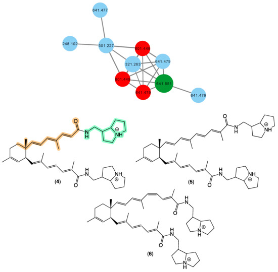 GNPS molecular family and structures for bistellettazines. Highlights: authentic sample of 4 (dark green), bistellettazines in CMB-01986 extract (red), potential new bistellettazines in the CMB-01021 extract (blue), and the pyrrolizidine (light green) and terpene (tan) sub-structures in 1.