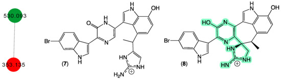 GNPS molecular family and structures for dragmacidins. Highlights: authentic 8 (dark green), 7 in CMB-02782 extract (red), and unusual chromaphore associated with 8 (light green).