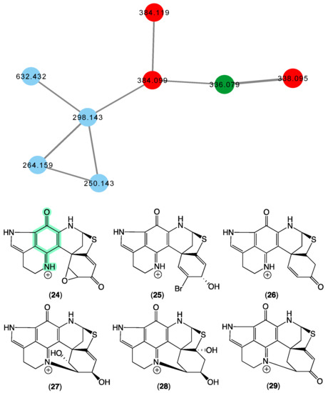 GNPS molecular family and structures for discorhabdins. Highlights: authentic sample of 29 (dark green), related discorhabdins in CMB-02720 and CMB-02523 (red), new discorhabdins in CMB-01879 (blue), and the pyrroloiminoquinone sub-structure common to 24–29 (light green).