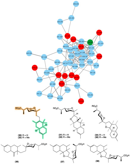 In 1987 [22], we reported the first occurrence of a family of norsesterterpene cyclic peroxides bearing an unprecedented carbon skeleton, trunculins A–B (30–31), and their methyl esters 32–33 from Latrunculia brevis (CMB-01738) collected by SCUBA (−20 m) off South Durras, New South Wales. This was followed in 1993 [38] with a report of trunculin F (34) and its methyl ester 35 from Latrunculia conulosa collected by SCUBA (−5 m) off Flinders, Victoria, and in 1998 [39], trunculins G–I (36–38) from a Latrunculia sp. collected in 1995 by SCUBA (−30 m) off a World War II submarine scuttled near Port Phillip Heads, Victoria. Terpene cyclic peroxides are a class of natural product unique to marine sponges, with empirical rules for assignment of peroxide configurations based on NMR chemical shifts proposed by Capon in 1985 [40], allowing for rapid identification of natural stereo diversity. The GNPS molecular network shown in Figure 8 revealed a family of nodes clustered around the authentic natural product trunculin B (30) (dark green) and analogues in the known trunculin producer CMB-01738 (red), as well as potentially new trunculins (blue) associated with three unidentified sponges; CMB-01001 and CMB-01723 collected in 1985 and 1995, respectively, by SCUBA (−20 m) off Durras, New South Wales, and CMB-01179 collected in 1991 by SCUBA (−25 m) off Port Phillip Heads, Victoria. The expansive diversity of new trunculin nodes suggests that these latter three sponge samples offer the prospect of an array of new members of this relatively rare structure class.