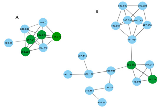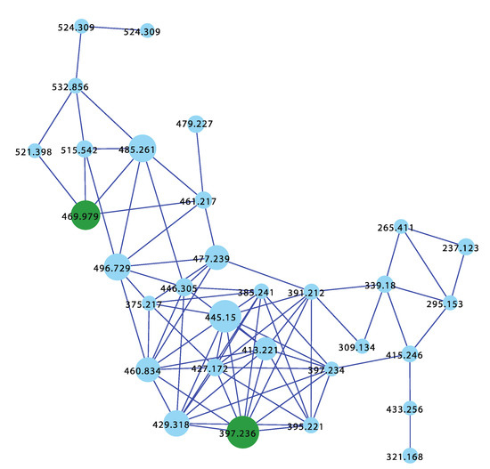 The sponges Sarcotragus sp. (CMB-01788) and Sarcotragus sp. (CMB-01848) collected in 1995 during scientific trawling operations (−30 m and −85 m, respectively) in the Great Australian Bight, Sarcotragus sp. (CMB-02707) and Sarcotragus sp. (CMB-02717) collected in 1998 by SCUBA (−10 m) off Deal Island, Bass Strait, and Sarcotragus sp. (CMB-03390) collected in 2001 during commercial trawling operations in the Great Australian Bight, had not been subjected to chemical analysis. The GNPS molecular network shown in Figure 14 on these five Sarcotragus spp. revealed a common molecular family co-clustering with authentic samples of 62 and 15 (dark green)—confirming that GNPS could be used to detect/dereplicate Sarcotragus sesterterpene tetronic acids.