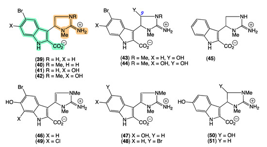 In 2008 [26], we reported the first natural examples of an indolo-2-carboxylate bearing a 2-amino-4,5-dihydroimidazole moiety, trachycladindoles A–G (39–45) from Trachycladus laevispirulifer (CMB-03397) collected in 2001 during commercial trawling operations in the Great Australian Bight. We subsequently patented the trachycladindoles as potent and selective kinase inhibitors with potential application in the treatment of neurodegenerative diseases (i.e., Alzheimer’s and Parkinson’s diseases) [41]. Unfortunately, with available supplies limited to <1 mg and targeted resupply of the Australian deep-water source Trachycladus sponge impractical, combined with no other literature reports of trachycladindoles, further investigations of this promising pharmacophore were stalled. Efforts at investigating structure activity relationships using available material were also compromised by the observation that on storage (−30 °C in DMSO) trachycladindoles E (43) and F (44) underwent quantitative deformylation to trachycladindoles A (39) and C (41) [42].