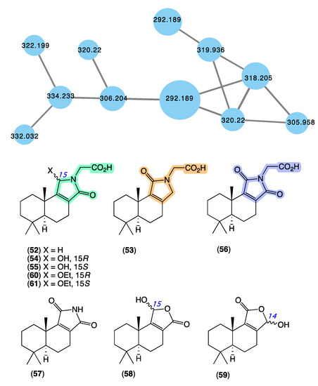 The GNPS molecular network shown in Figure 10 revealed a molecular family uniquely associated with Dysidea sp. (CMB-01171) collected in 1991 by SCUBA (−25 m) off Port Phillip Heads, Victoria. Although this specimen had been in our collection for over 30 years, it had failed to be noticed. Consequently, we were intrigued to have the GNPS analysis reveal natural product nodes unique to this Dysidea sp., especially given the extensive history of Australian Dysidea sp. chemistry (see above). Following a chemical investigation, in 2020 [13], we reported on a suite of new sesquiterpenes from Dysidea sp. (CMB-01171), including dysidealactams A–F (52–57), dysidealactones A–B (58–59), and two solvolysis artifacts 60–61. Of particular note, dysidealactams A–D (52–55) incorporate a rare glycinyl lactam moiety (see ircinialactams above), and 56 incorporates an unprecedented glycinyl imide moiety. Due to a prolonged storage in EtOH, it is quite common to observe the esterifaction of carboxylic acid groups to the corresponding ethyl esters [42]. The dysidealactams and dysidealactones immediately attracted the attention of synthetic chemists, with successful synthesis reported in 2023 [69].