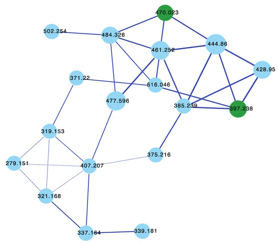 In 2010 [16], we reported franklinolides A–C (1–3) (Figure 2) from a marine sponge-complex (CMB-01989) consisting of a massive Geodia sp. thinly encrusted with a Halichondria sp., collected in 1995 during deep water (−105 m) scientific trawling operations in the Great Australian Bight. The franklinolides were the first reported natural occurrence of polyketide phosphodiesters, and inhibited the growth of a range of human carcinoma cells, including colon (HT-29), prostate (DU145), ovary (JAM and C180-13S), and lung (A549). With the exception of a 2016 re-isolation of franklinolide A (1) from a Caribbean sponge Plakina jamaicensis [27], no other members of this structure class have been reported, with a 2022 review on natural phosphate esters reinforced the rarity of natural phosphodiesters [28]. While traditional dereplication approaches failed to detect alternate sources of franklinolides in our marine library, the GNPS molecular network shown in Figure 2 revealed a family of nodes clustered around the authentic natural product franklinolide A (1) (dark green) and analogues in the original CMB-01989 extract (red), associated with new nodes (blue) present in two unidentified sponges (CMB-01451 and CMB-01518) collected in 1993 by SCUBA (−15 m) in Port Phillip Bay, Victoria. Based on this analysis, these latter sponges are worthy of more detailed chemical analysis, and are expected to provide access to new franklinolides.