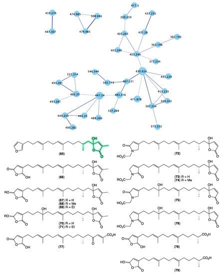 Returning to the GNPS molecular network, we noted that Cacospongia sp. (CMB-03404) collected in 2001 during commercial trawling operations in the Great Australian Bight featured a unique molecular family (Figure 15) that did not share any nodes with authentic sesterterpene tetronic acids, or any of the Ircinia, Psammocinia, or Sarcotragus spp. extracts noted above. This was initially perplexing as at an earlier time, and using more traditional UPLC-DAD and 1H NMR dereplication approaches, we dismissed this extract as containing known sesterterpene tetronic acids. Clearly, our initial assessment was incorrect, with the GNPS analysis prompting a more detailed chemical investigation. In 2018 [14], we reported on an unprecedented family of sesterterpene α-methyl-γ-hydroxybutenolides, cacolides A–L (65–76), together with the biosynthetically related cacolic acids A–C (77–79) from Cacospongia sp. (CMB-03404) (Figure 15). Had it not been for the detection of a unique GNPS molecular family for CMB-03404, it is likely that our original dereplication assessment would had held, and this extract would have remained dormant in our collection for many more years. This experience reinforces the need to be cautious in all dereplication, and be willing to revise determinations when contradictory data emerge.