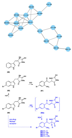 The GNPS molecular network shown in Figure 16 revealed a unique molecular family inclusive of multiple nodes associated with Thorectandra choanoides (CMB-01889) collected in 1995 during deep water (−45 m) scientific trawling operations in the Great Australian Bight. As a result, this sponge was targeted for detailed chemical analysis and, in 2021 [15], we reported on a new tryptophan alkaloid, thorectandrin A (81), along with an array of known analogues, including 6-bromoaplysinopsin (82), 6-bromo-1′,8-dihydroaplysinospin (83), and an array of solvolysis adducts 84–87. The GNPS thorectandrin molecular family clusters were particularly useful at revealing solvolysis artifacts. Close examination of these compounds led us to speculate that 82 (and 80) could serve as a substrate for an indoleamine 2,3-dioxygenase-like (IDO) enzyme, resulting in transformation to the intermediate ring opened produce 82a, which, as a potent Michael acceptor, could act as a cellular toxin (explaining some of the observed “aplysinopsin” biology). Alternatively, the intermediate Michael acceptor 82a could form solvolysis adducts during handling, such as 83–86. By contrast, the reduced aplysinopsin analogue 83 might also be viewed as a prospective IDO substrate, being transformed to the thorectandin 81 which was not a Michael acceptor and, hence, not toxic. As a result, the discovery of 81 shed light on a previously unappreciated “aplysinopsin” chemical reactivity and ecology, where some aplysinopsins (i.e., 80 and 82) can be viewed as pro-drug Michael acceptors that are activated by IDO’s in the tissues of species that prey on sponges, allowing them to act as potent Michael acceptor toxins. This same mechanism of action likely plays out in mammalian and microbial cells, explaining the anticancer and anti-infective properties of selected aplysinopsins that are pro-drug Michael acceptors.