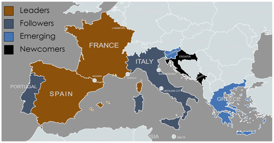 Northern Mediterranean countries (Croatia, Greece, France, Italy, Montenegro, Portugal, Slovenia and Spain) that participated in this study based on their development status (leader, follower, emerging and newcomer) as assessed in [3]. Created with mapchart.net.