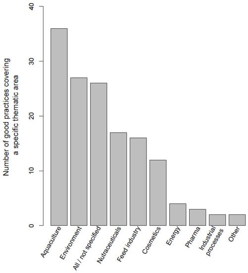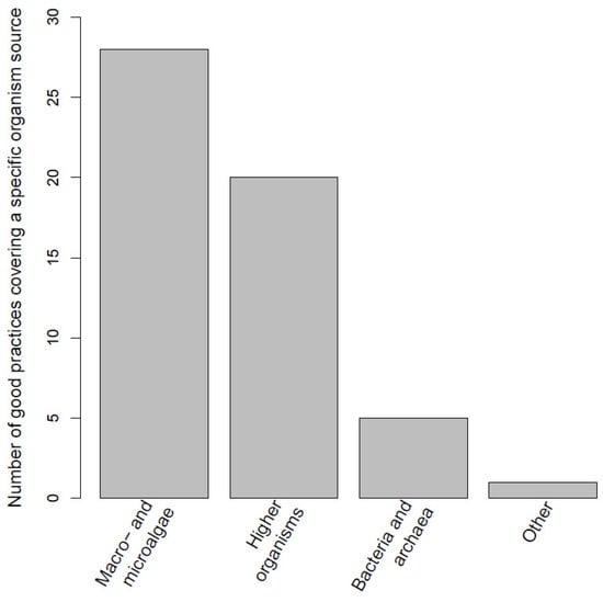 We first identified the existing good practices in the marine biotechnology sector that are in development, already implemented or ready to enter the market. A total of 89 good practices involved at least one of the project partners’ countries (the Northern Mediterranean countries of Croatia, Greece, France, Italy, Montenegro, Portugal, Slovenia and Spain). These individual good practices focused on one, more or all sectors (aquaculture, cosmetics, energy, environment, feed industry, industrial processes—enzyme and catalysts, nutraceuticals, pharmaceuticals and other) and are shown in Figure 2. Among these, 55 good practices deal with a specific group of organisms (Figure 3), while the rest are either of a strategic nature, or are not specific for any particular type of organism. The full list of good practices is available as Supplementary Table S1.
