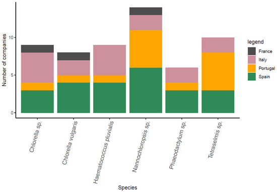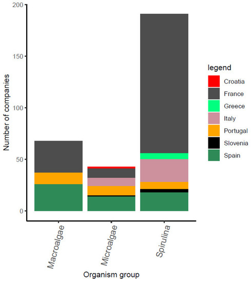 In the Northern Mediterranean countries (Portugal included) there are currently 280 companies producing algae found through European Marine Observation and Data Network—EMODnet [31] and through the project partners from Mediterranean countries. The produced organisms by companies from different Mediterranean countries within the B-Blue project are shown in Figure 4. The figure includes the genus Arthrospira (Spirulina) as well, as this cyanobacterium is widely used for industrial production due to their biocompounds content, including biopeptides, biopolymers, pigments, carbohydrates, essential fatty acids, minerals, oligoelements and sterols [32]. The taxonomic classification of Arthrospira (Spirulina) is an ongoing discussion in the scientific community [33,34] and is beyond the scope of this work, hence, it is represented as a standalone taxon which is also historically very important from the consumers’ and the industrial perspective [34,35]. Their widespread production is also clearly seen in the Northern Mediterranean region, with France owning the majority (72%) of companies specialized in the cultivation of this cyanobacterium. Microalgae and macroalgae have fewer producer companies. Interestingly, macroalgae are produced in only three of the B-Blue Mediterranean countries (France, Spain and Portugal). The official data have no records about microalgae cultivation in Greece, Slovenia and Croatia. However, Greece has proven experience and capacity in microalgae cultivation of the species Isochrysis sp., Chlorella sp., Tetraselmis sp., Nannochloropsis sp., Rhodomonas sp. and Dunaliella sp. on an industrial scale, as part of the daily routine of several hatcheries, which support larvae feeding in fish farms. Croatia has an enterprise in microalgae cultivation (hatchery) and Slovenia reports three enterprises in the last five years producing small quantities of microalgae and Spirulina.
