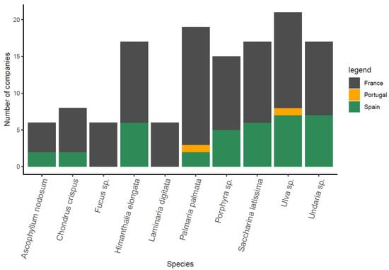 Macroalgal species that are most often cultivated in the B-Blue countries by registered companies. Different colors denote the producer countries.