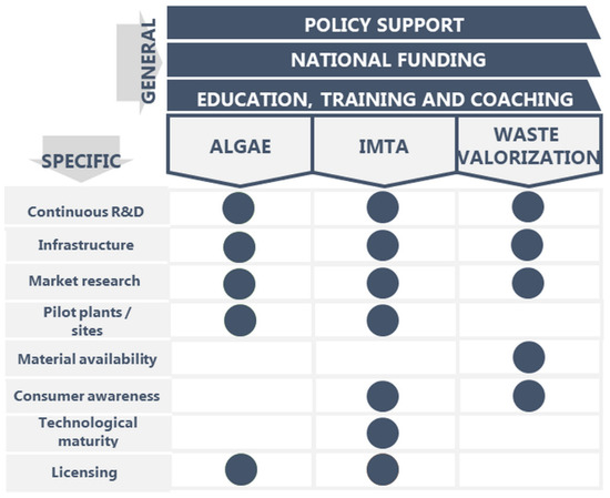 Concerning the development of algae production, there is a need to improve data quality and additional research, knowledge sharing and collective action to expand cultivation beyond the currently limited commercial species. Cooperation among stakeholders, collaboration with producers and research institutions should be integrated into R&D to define good practices and introduce cost-effective technologies for algal producers. To optimize the time efficiency and cost-effectiveness of the production of algal biomass and compounds, further market research is needed to understand the opportunities of the sector in the Northern Mediterranean region. This can lead to proposing strategies to manage social and economic risks. Importantly, the standardization of biomass production, licensing framework and licensing procedures are needed, as they can affect processing and production capabilities. Current processing technologies allow the obtaining of a large portfolio of products for largely different applications. However, to increase the relevance of the algal sector, additional end products must be targeted, which requires the development of new processing technologies. Additionally, the import of products with misleading labelling and abiding by specific EU/national directives (e.g., irradiation, heavy metals, etc.) is an issue that has to be properly addressed. In terms of licensing and patenting, these steps may significantly delay the time to market due to the lengthy compliance processes, on one hand, and the patent regulation obstacles on the other, considering also that patent protection is time limited and has to be renewed after several years [93]. Moreover, patent subjects cannot be published until the patent is approved and even after the patent is granted, the protection is territory- and time-limited [93]. Finally, adequate infrastructure is needed for algae production. This will not be feasible without public incentives. However, incentives to promote national production are limited, including the quality control of imported biomass, which often represents unfair competition between producers and importers. Interestingly, an opportunity to develop this emerging value chain has resulted as a consequence of the COVID-19 pandemic, that is, the need to use local resources [94,95]. It is therefore no longer advisable to buy biomass from abroad or even overseas, but rather to use local suppliers. This is also driven by the market and end-users looking for high value-added products. In the Mediterranean region, the extensive coastline offers suitable preconditions for developing large-scale cultivation of algal biomass. Several production technologies have already been piloted, however, a bottleneck in the economically viable exploitation of macro- and microalgae is the lack of an efficient, industrial scale cultivation technology. The establishment of regional pilot plants and small biorefineries could encourage and boost further investments. The expansion of microalgae farming, large on-shore or off-shore seaweed farming, and especially innovative applications, require extensive support in both capital investment and, most likely, in their short-medium term operation until profit sea-margin can be achieved. Few success stories exist worldwide and they all started up with significant access to research and capital credit, either public or public-private partnerships, until they can be financially self-sustainable on their revenues.